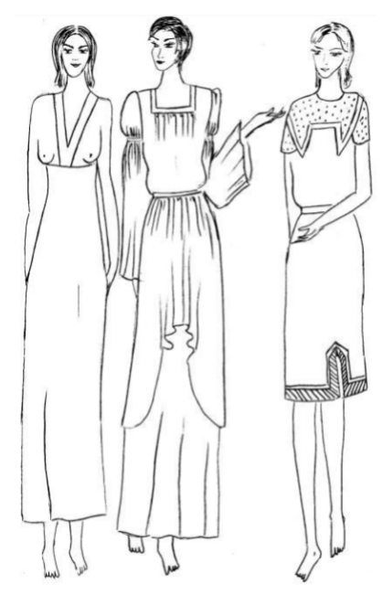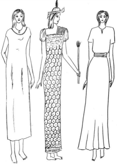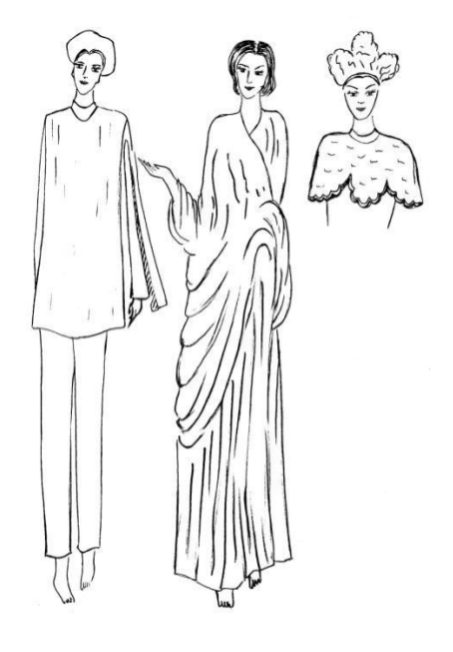 Perkembangan bentuk poncho terlihat pada bentuk busana yang dimasukkan dari kepala. Perkembangan celemek panggul terlihat pada bentuk busana yang dibungkus atau dililitkan ke badan mulai dari pinggang ke panggul.