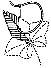 - kemudian kembali lagi ke lubang yang sama, menarik benang (membentuk loop) hampir sepenuhnya sampai ke bawah,