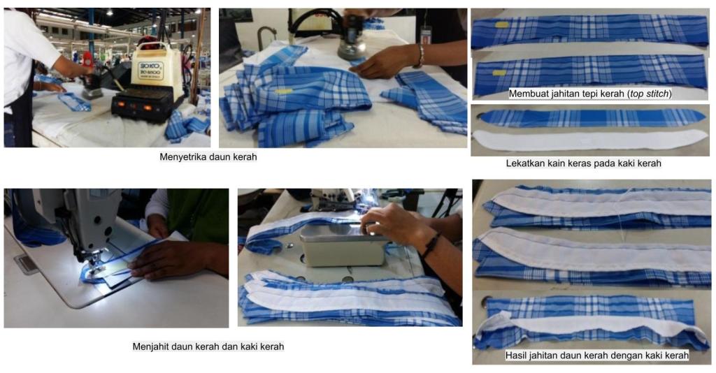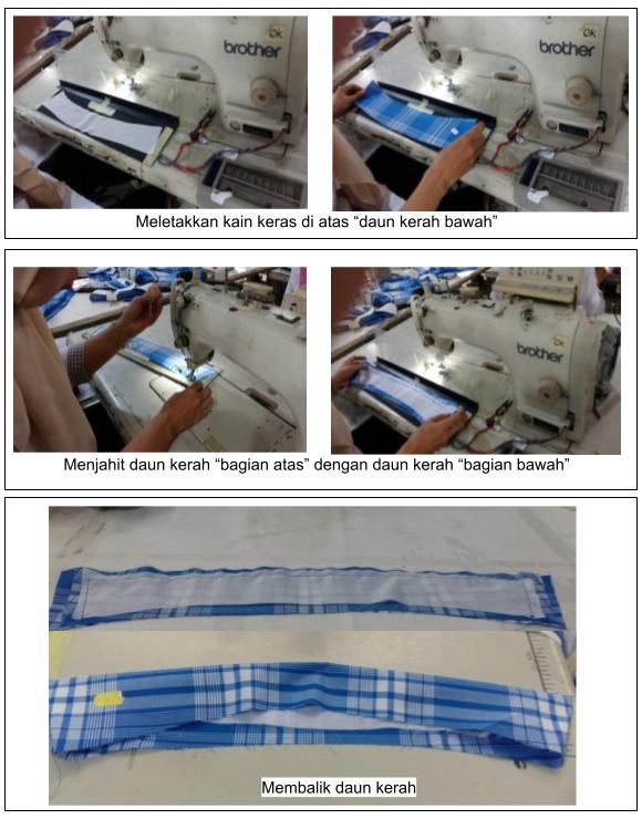 - Menjahit bagian atas kerah (daun kerah atas dengan daun kerah bawah) membentuk kantong dengan menggunakan cetakan.