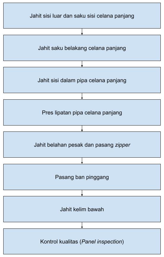 Untuk membuat celana panjang sesuai dengan sampel, tertib kerja atau perencanaan produksi dimulai dari bagian administrasi produksi yang akan menghitung dan memeriksa kelengkapan jumlah potongan-potongan kemeja yang dikirim dari lini cutting.