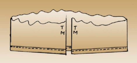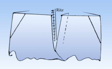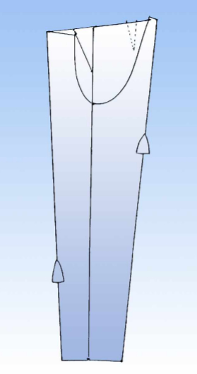 Gambar pressing lipatan pipa celana panjang - Setelah melalui proses pressing baru dua pipa celana disatukan oleh sub lini pesak yang akan menggabungkan pipa celana kiri dan kanan sekaligus menjahit belahan pesak dan memasang ritzsluiting. Satukan pipa celana bagian kiri dan kanan dengan cara menggabungkan garis lingkar pesak ujung belakang atas sampai dengan tanda batas pemasangan ritzsluiting dengan setikan rapat. Rapikan kampuh dalamnya dengan menggunakan mesin obras benang tiga.