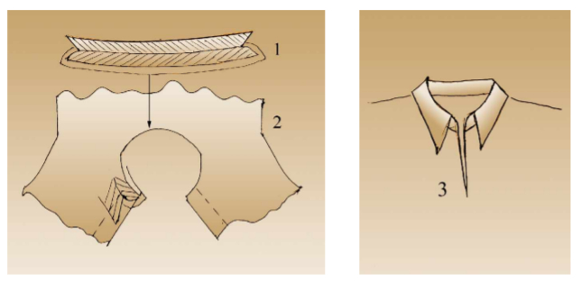 Gambar pasang lengan kemeja - Jahit kerah (yang sudah ditempel kain keras) pada satu lembar penegak (yang sudah ditempel kain keras). Pasangkan bagian tersebut pada kerung leher dari bagian dalam. Gabungkan lembar penegak satunya ke penegak yang sudah terpasang, rapikan bagian bawahnya.