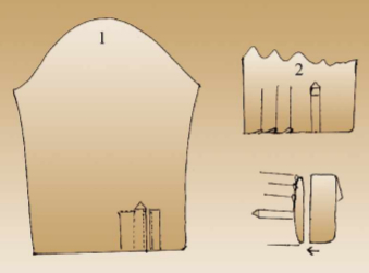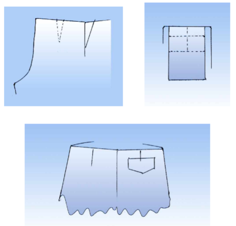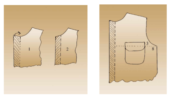 Gambar pressing belahan tengah muka, tutup saku, manset dan pengeras kerah. - Kemudian sub lini pasang saku akan menjahit saku tempel beserta penutupnya pada bagian dada kanan dan kiri. Mulailah menjahit tutup saku kemeja, pasang sesuai tanda. Setelah tutup saku terpasang, bagian saku dijahit di bawahnya posisi lurus tutup saku.